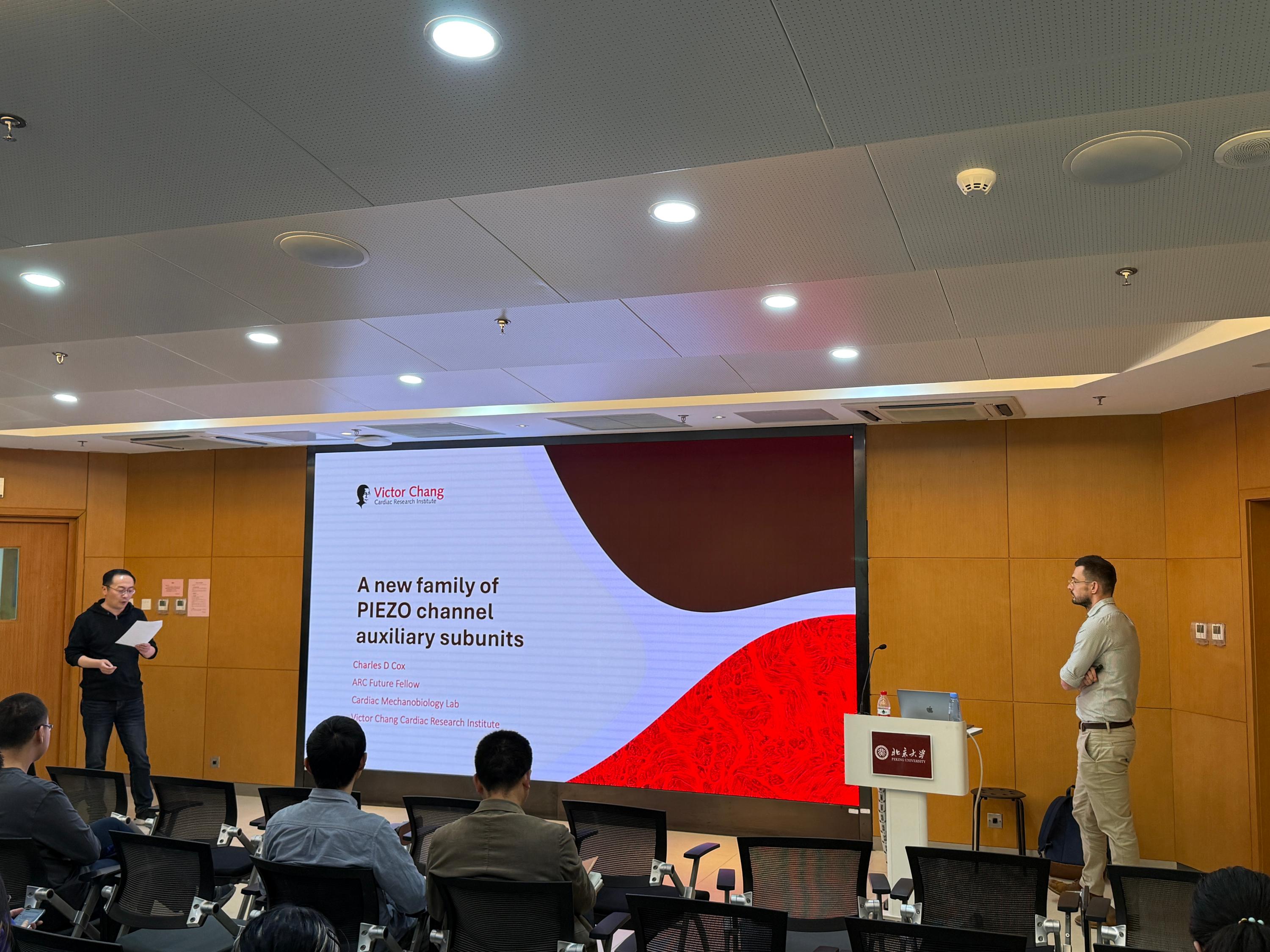 On April 9, 2025, Prof. Charles Cox from the Victor Chang Cardiac Research Institute was invited by Prof. Chen Song to deliver a CQB seminar titled "A new family of PIEZO channel auxiliary subunits". He introduced his team's discovery of MyoD-family inhibitor proteins (MDFIC and MDFI) as auxiliary subunits of PIEZO1/2 channels. Cryo-EM studies revealed their direct binding to PIEZO2's pore module. Prof. Charles Cox provides extensive data, highlighting their role as key regulators integrating mechanical signals into transcriptional pathways.