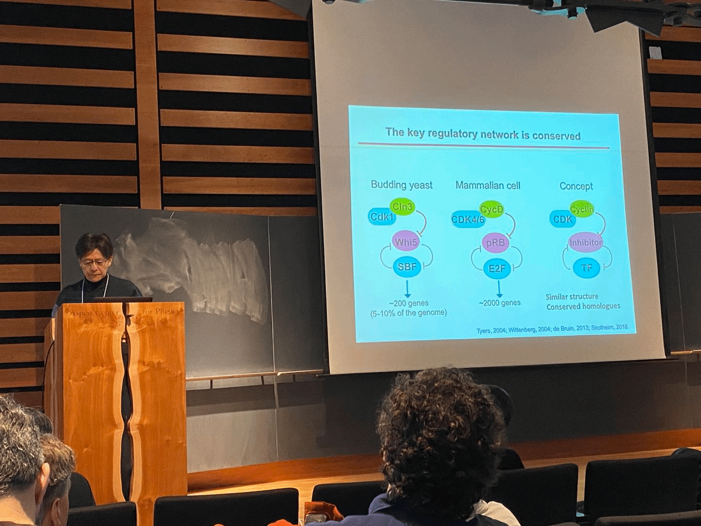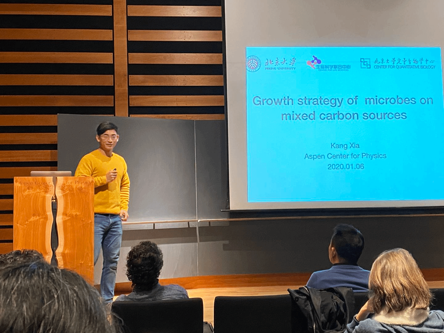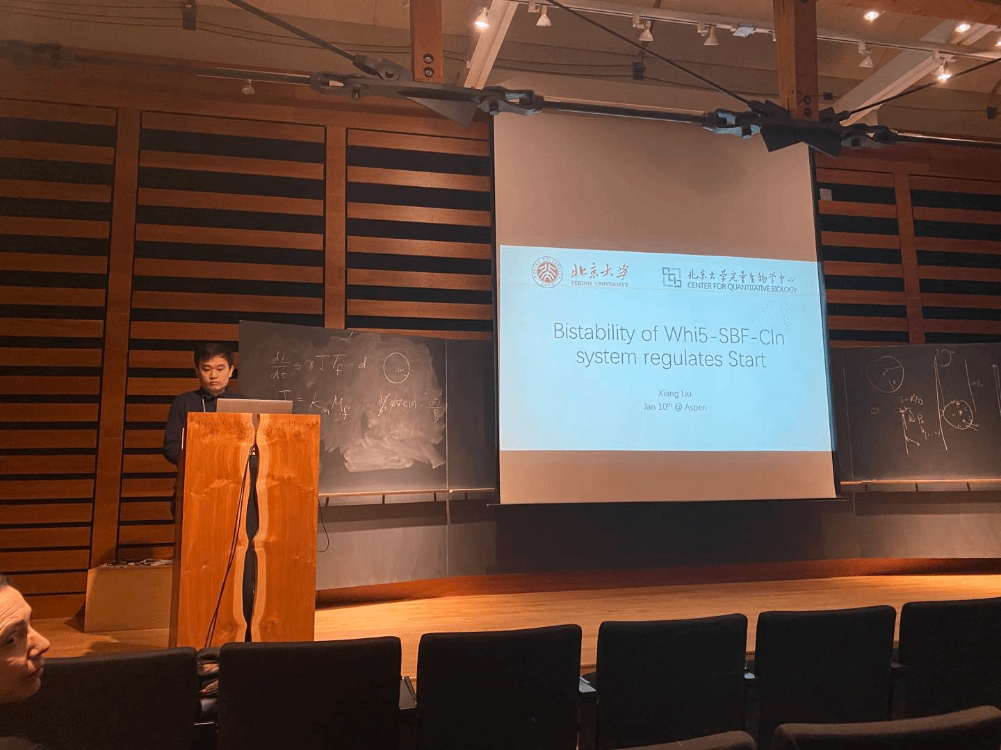 2020年1月5日至10日,汤超教授和实验室成员刘祥、夏康和杨宁参加了Aspen冬季会议,会议主题为“New physcial model for cell growth”,来自美国、欧洲等地的几十名学者讨论细胞生长的实验工作和理论进展。汤超教授作大会报告,题为"The role of Whi5 in coordinating growth and division in yeast",详细报告了实验室近些年对芽殖酵母细胞周期机制的研究,尤其是对start transition起重要作用的Whi5蛋白的实验进展及模型理解。刘祥、夏康和杨宁均作了口头报告,刘祥题目为“Bistability of Whi5-SBF-Cln system regulates start", 从动力学模型角度给出Whi5对Start transition的双稳态机制,并分析其中细胞生长带来的浓度稀释和Cln蛋白的磷酸化在其中的作用;夏康题目为"Growth Strategy of microbes on mixed carbon sources",从代谢网络拓扑出发,通过优化蛋白质分配,给出了定量的解释细菌面对多种碳源的进食策略的理论模型;杨宁题目为"Information processing strategy inchanging environment",从信息论角度讨论了当细胞看作一个信号处理系统,怎么面对变化的环境作出最合适的响应。