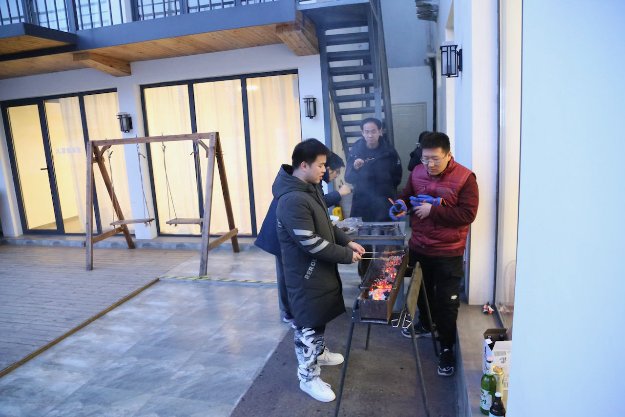 火锅时间,做饭小组制作了味道丰富的汤底,几个热气腾腾的锅边摆满了食材。大家频频举杯,为了实验室广大前程,为了祖国万岁,为了世界和平。屋外烧烤架也开工了,烤串、烤香菇、烤栗子,为澄澈寒冷的冬夜带来几丝温度。