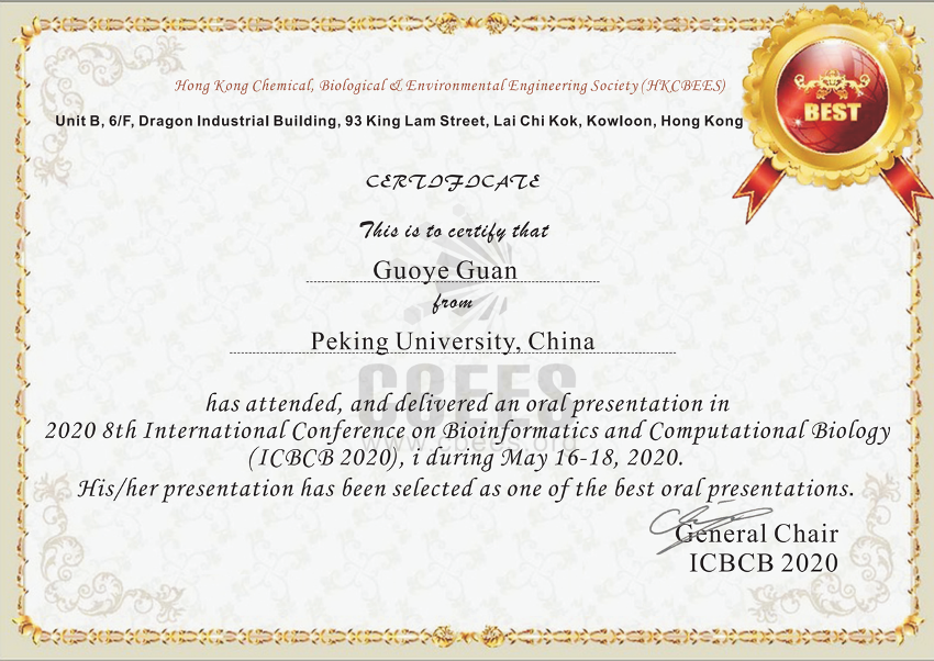 Organized by IEEE and BBS, the 2020 8th International Conference on Bioinformatics and Computational Biology (ICBCB 2020) was held online from May 16th to 18th, 2020. Ph.D student Guoye Guan attended the meeting, introduced the project “Investigating Spatio-Temporal Interactions in Embryonic Morphogenesis by 4D Cell-Nucleus Imaging and System-Level Comparative Analysis - Taking Eutelic Nematodes C .elegans and C. briggsae as Examples” and was awarded one of the Best Oral Presentations. The nematode species usually have precise developmental programs at single-cell level. In contrast to the manually-perturbed embryos (e.g., mutation and compression), comparing normally-developing systems can make the observations more reliable and reproducible, and help investigate the underlying biophysical mechanisms such as the coordination between cell division timing and cell positioning. In this work, we collaborate with Prof. Zhongying Zhao’s Lab at HKBU and generated 4D cell migration data of 11 wild-type embryos for both C. elegans and C. briggsae. We identified the significant distinctions of cell division timing and cell positioning between these two animals, and analyzed how cell division timing might affect cell positioning. This work will be published in IEEE ICBCB 2020 Conference Proceedings and archived in IEEE Xplore.