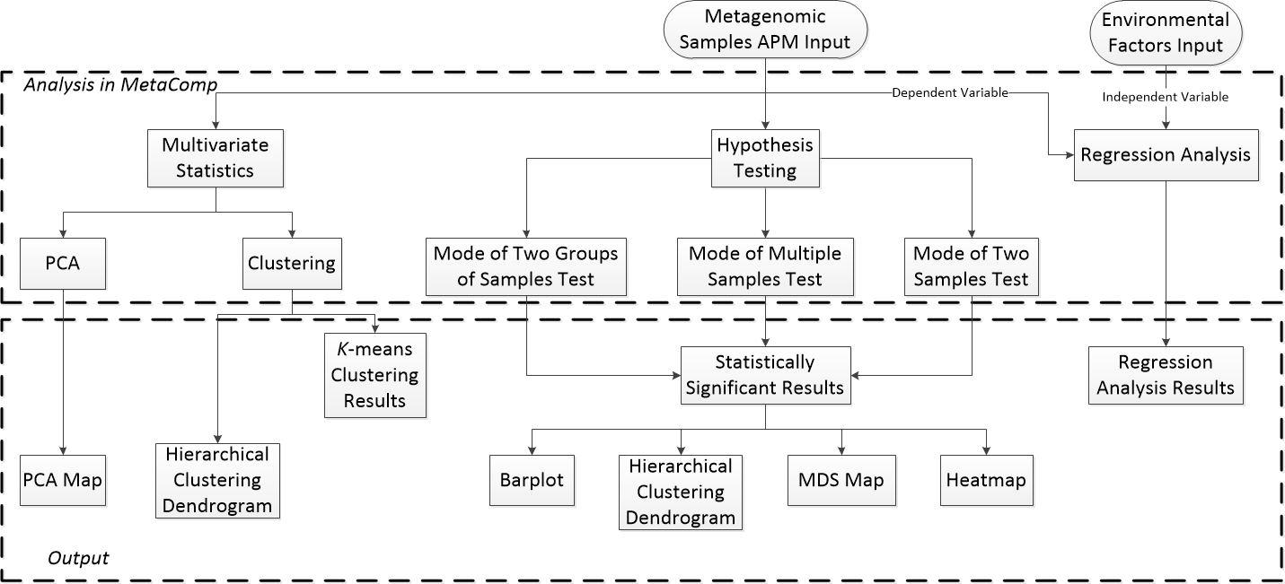 The input data of MetaComp include meta-omics data input (for all analyses) and environmental factors input (only for regression analysis). The analysis procedure in MetaComp consist of three independent parts: multivariate statistics (PCA and cluster analysis), statistical hypothesis tests (two-sample test, multi-sample test and two-group sample test) and regression analysis of environmental factors. The outputs are provided in Excel spreadsheet (k-means clustering results, statistically significance for each feature and regression analysis results) and visualized in diagrams (PCA map, hierarchical clustering dendrogram, bar plot, MDS map, heat-map).