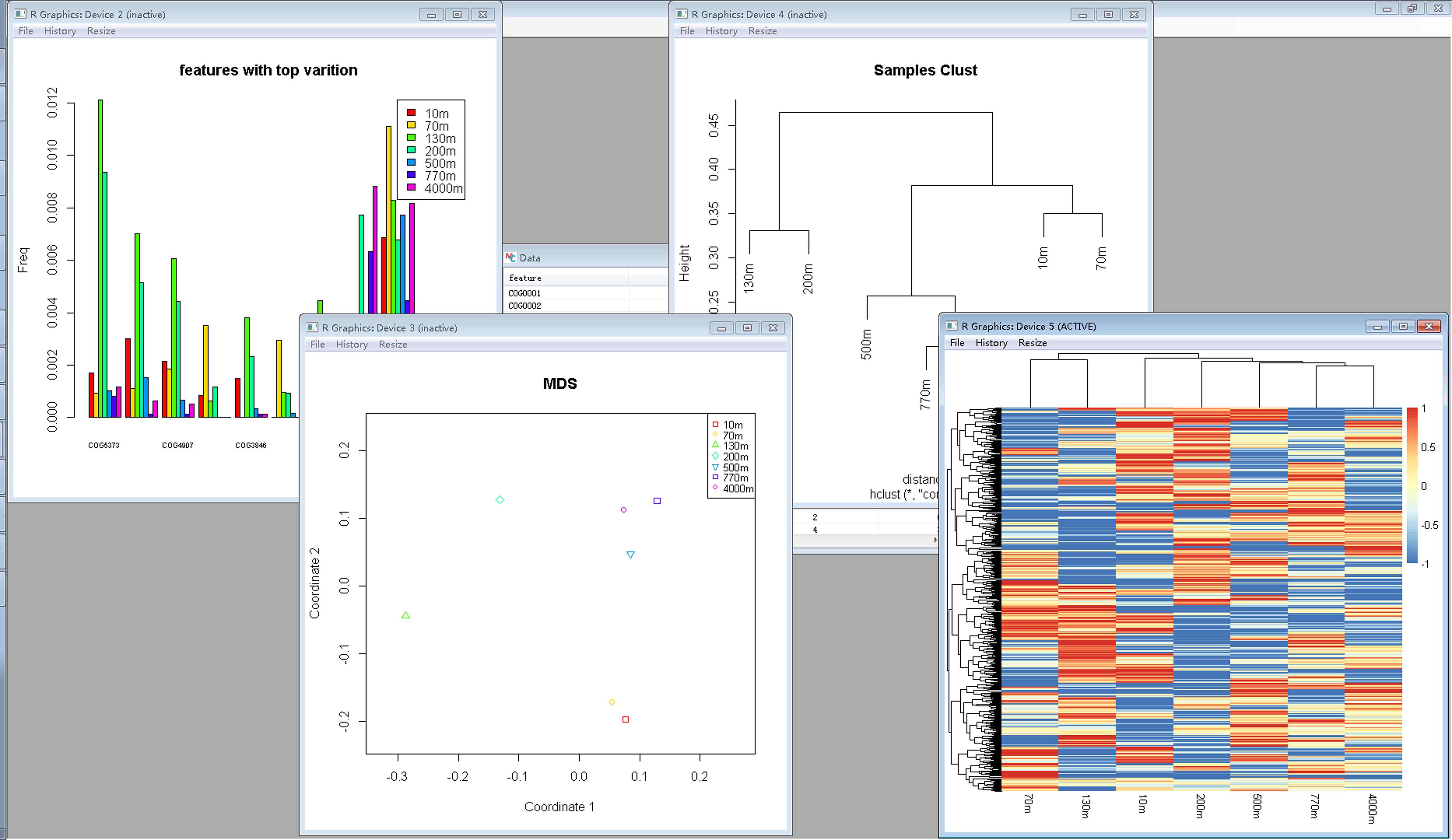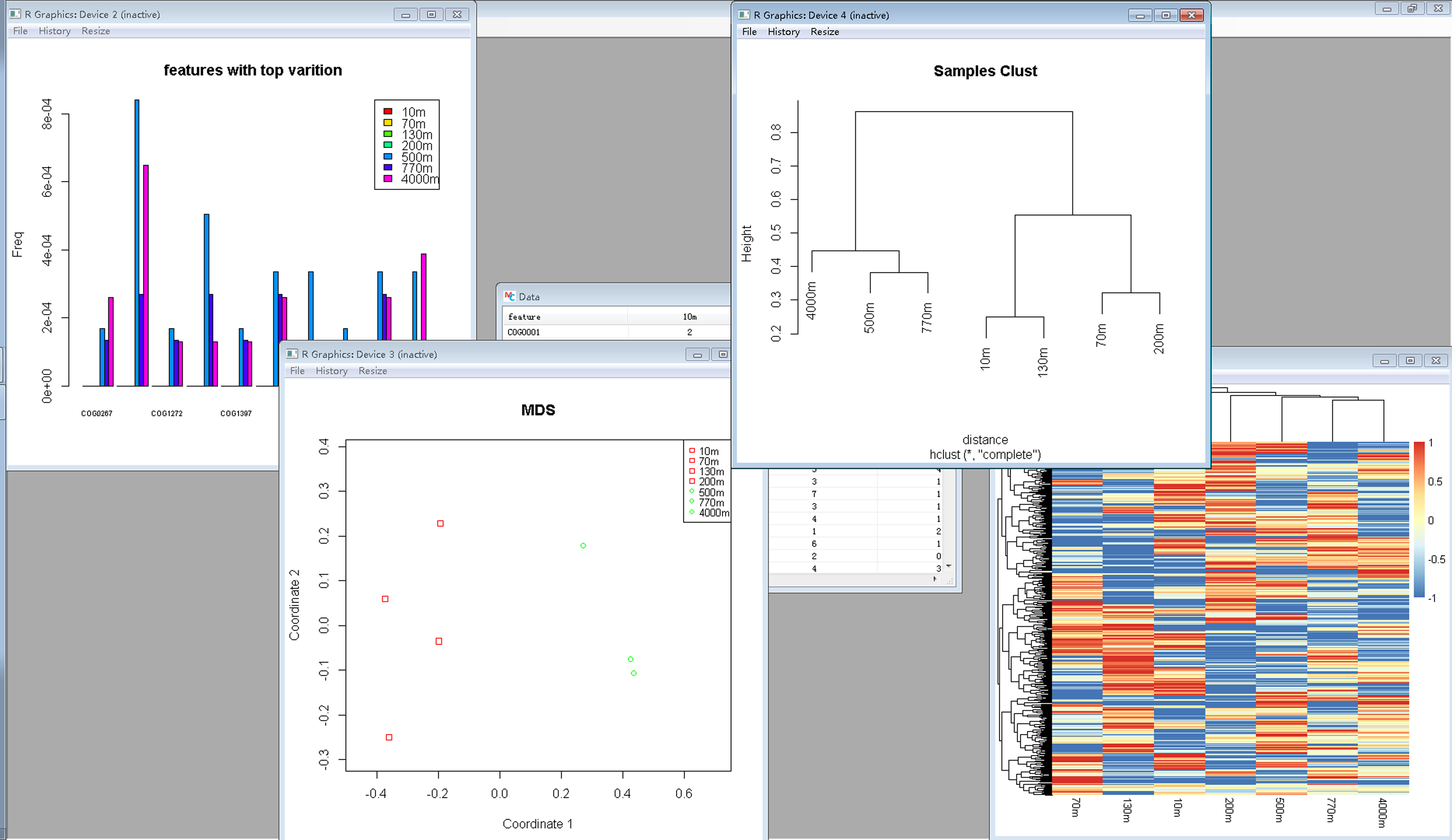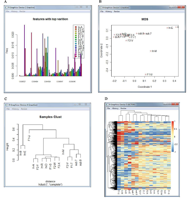 Figure 35: Visualized analysis result for multi-sample test, from left to right: heatmap, multi-dimensional scaling (MDS), hiearchical clustering and bar plot for top ten significant differential features.