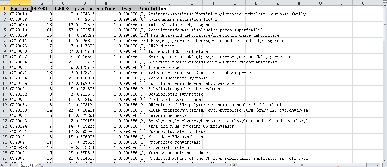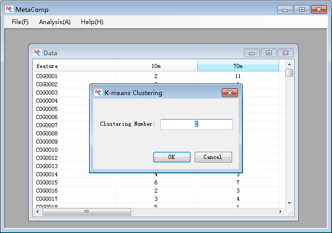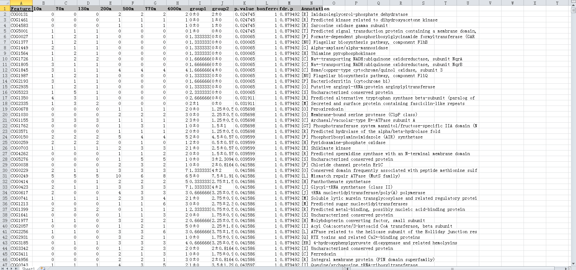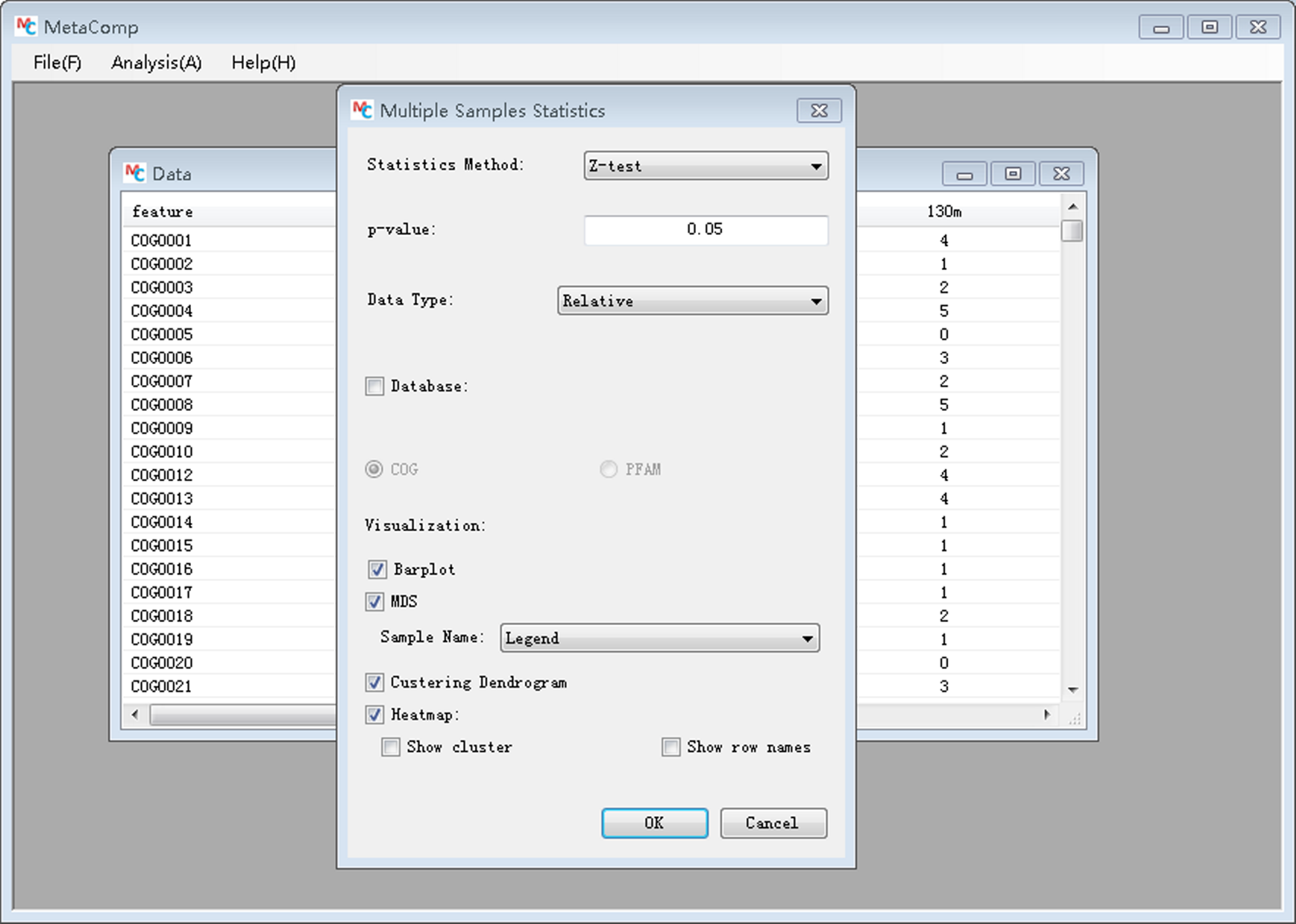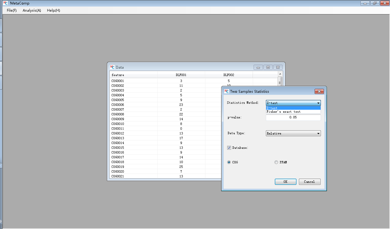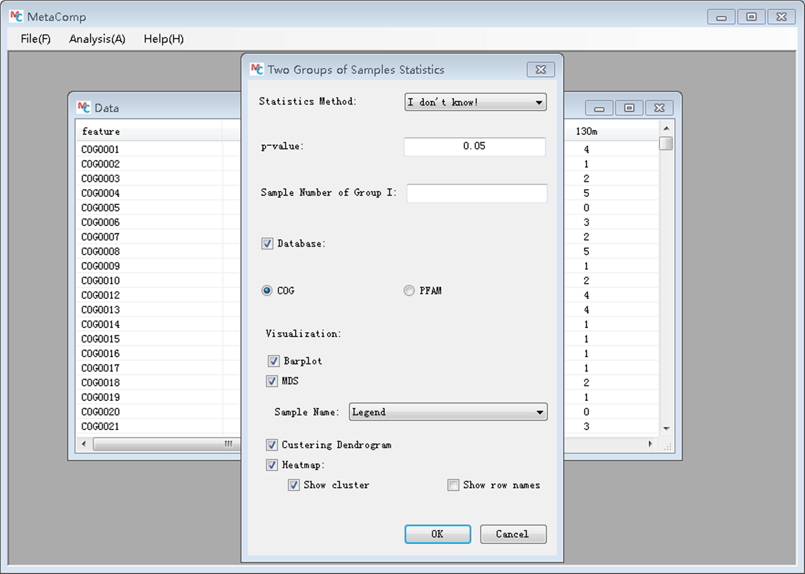 To analyze two group of samples, click on theTwo group of samples Statisticdialog inAnalysismenu. In this dialog, you can choose a favorable statistical test, group number andp-value. Meanwhile, you can chooseI do not knowoption inStatistics Methodcombo box while you do not know which method is the most suitable statistics test according to you input profile. Also, you can choose the database you require if the feature in your profile is Pfam or COG database.(Figure 36-38)