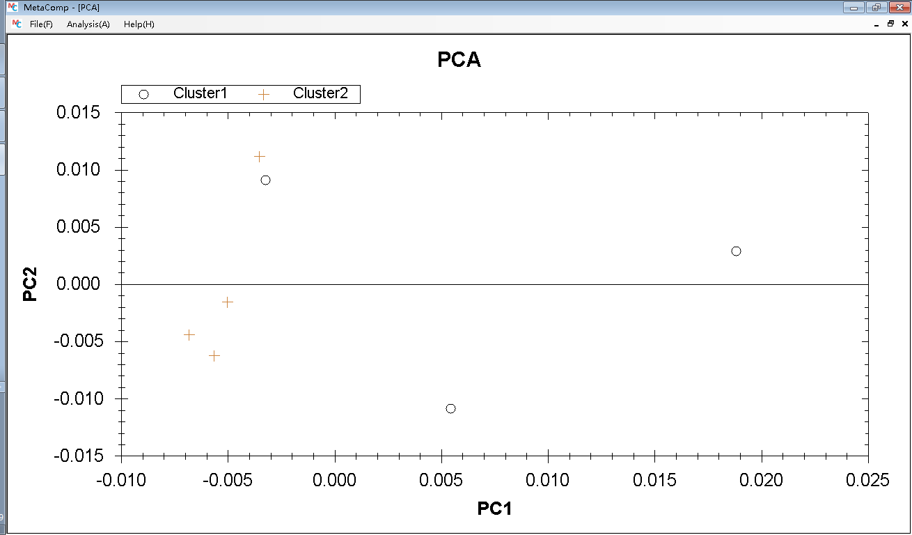 MetaComp employs principal component analysis (PCA) and clustering approaches (e.g.k-means clustering and hierarchical clustering) to present an overview of the differences among the given sets of meta-omics samples and highlight main features for each sample. Though it is a descriptive statistical function, these results are indispensable visualizations of meta-omics features. For example, enterotypes is illustrated by PCA figure.