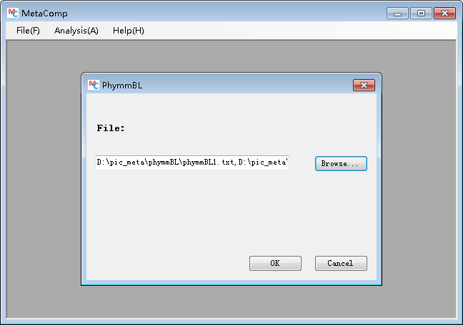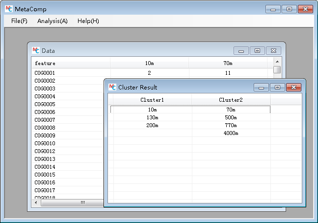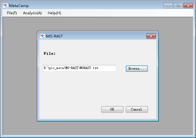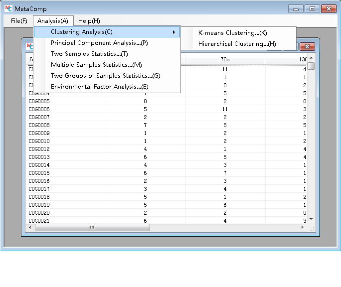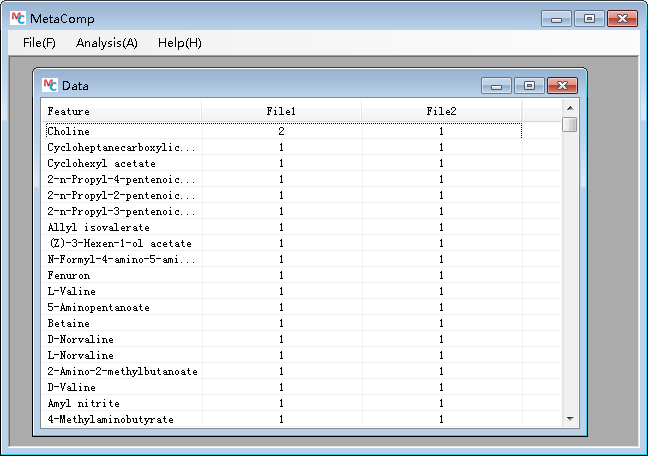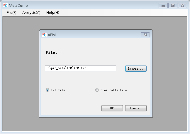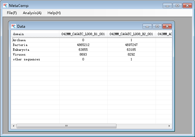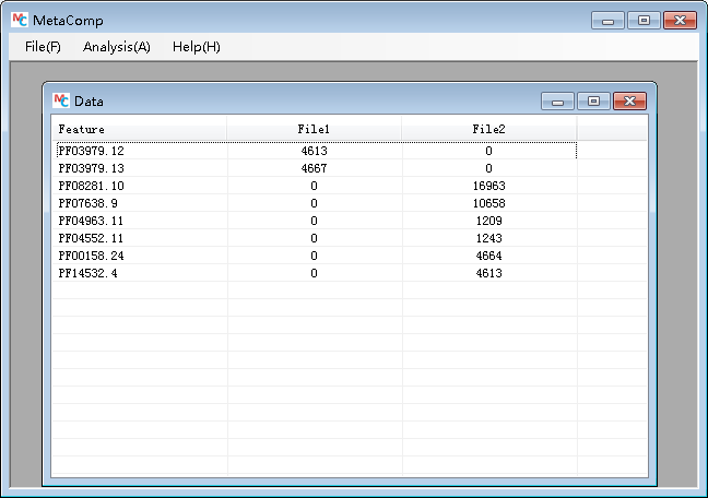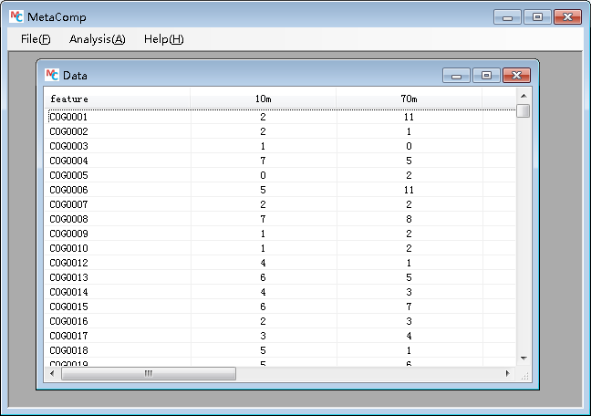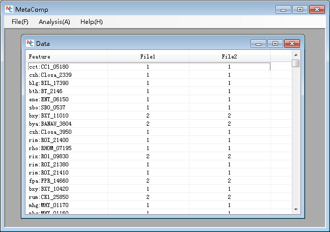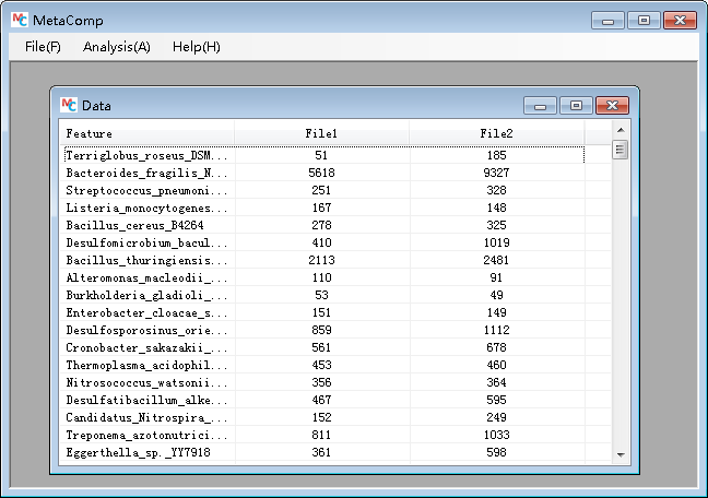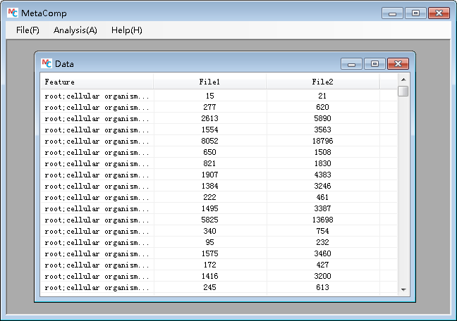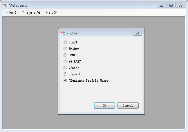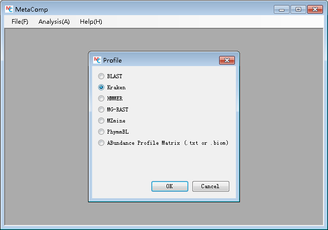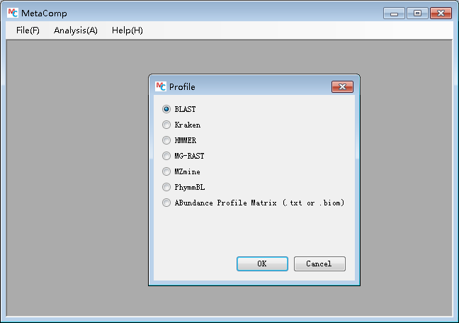 MetaComp reads input file in text format, and the values in the file should be separated by tab. The first row of the file shows the name of samples, while the first column represents the selected statistical feature. The cell of the table indicates the hit number of one sample to the given feature. Users must selectAbundance profile matrix (.txt or .biom)radio button fromProfiledialog box inLoad Dataoption withinFilemenu before choose the input profile. Moreover, the .biom format input must be convert to biom.table format before loading.(Figure 1-3) This format of input is the only format that can be load in Linux version. The command line is as follow: