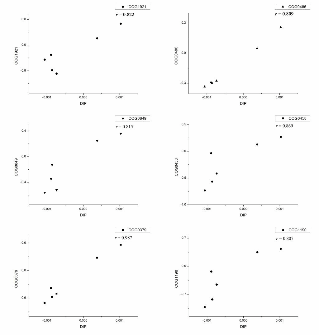 These diagrams exhibit the relationship between DIP and selected functional genes categorized by COG (COG0379, COG0458, COG0486, COG0849, COG1190 and COG1921). It is obviously that the abundance of these genes is linear with the content of DIP.