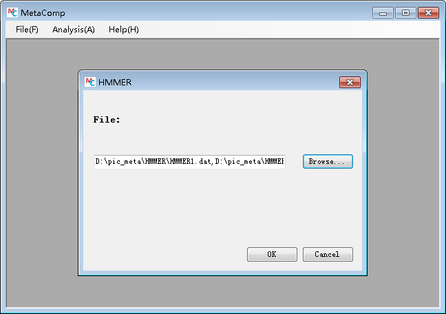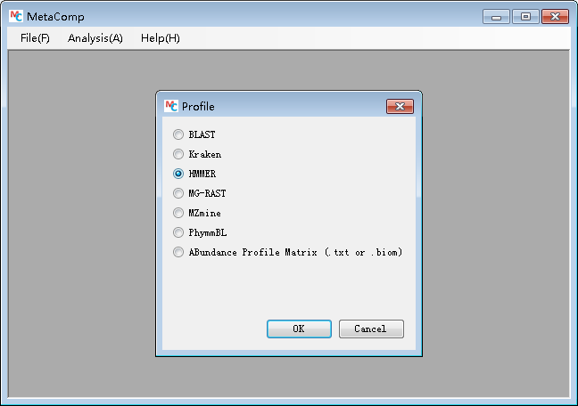 The input profile can also be acquired from HMMER ([3], http://hmmer.org/). Afterhmmer-3.1b2.tar.gzdownloaded and unpacked, you can get the desired results fromhmmsearchcommand. MetaComp can convert these file into MetaComp-compatible profiles through selectingHMMERradio button convert these BLAST results to standard Abundance profile matrices (APM) data through selectingBLASTradio button fromProfiledialog box inLoad Dataoption withinFilemenu. Click on theOKbutton after selecting the result file you wish to convert. (Figure 7-9)