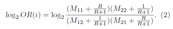 Where R = M1/M2. According to the formula above, features are categorized as group 1 enrichment (when log2OR(i) > 1) or group 1 scarcity (when log2OR(i) < 1).