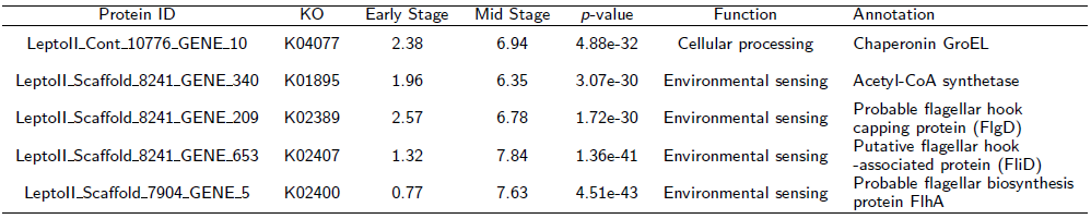 We further observed that abundance of 65 out of 144 proteins identified previously as early stage expressed demonstrate significantly lower (p< 0.05) in early growth stage than intermediate stage. Meanwhile, previously identified intermediate stage expressed proteins indicate ap-value less than or equal to 4.18e-30. With thisp-value as threshold, 19 proteins still express significantly larger in intermediate stage than early stage, within which 10 proteins are engaged in environmental sensing procedure, others also correspond with specific cell processing and metabolic processing (seeAdditional file 4andAdditional file 15: Figure S1 to S3for more information). For example, LeptoII_Cont_10776_GENE_10 annotated as an important heat shock protein--GroEL, is regulated by RNA polymerase subunit sigma 32 during heat stress [2]. LeptoII_Scaffold_8241_GENE_340 annotated as Acetyl-CoA synthetase is also demanded in stationary phase rather than exponential phase to reduce fatty acids generated from membrane lipids [3]. Moreover, flagella synthesis related proteins (LeptoII_Scaffold_8241_GENE_209 annotated as FlgD, LeptoII_Scaffold_8241_GENE_653 annotated as FliD and LeptoII_Scaffold_7904_GENE_5 annotated as FlhA) are classified as intermediate expressed protein by MetaComp. According to the previous results [1], other flagellar proteins are expressed during intermediate and late stages of growth. We further noticed that LeptoII_Scaffold_8241_GENE_209, LeptoII_Scaffold_8241_GENE_653 and LeptoII_Scaffold_7904_GENE_5 only take parts in middle procedures of flagella biosynthesis other than from the beginning procedures [4]. Therefore, these genes identified as mainly expressed in intermediate stage by MetaComp is reasonable (these genes are listed in Table 1).