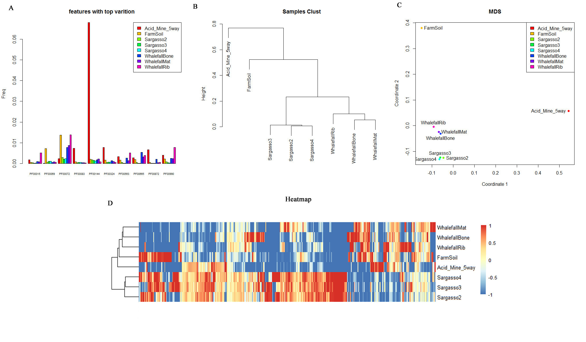 (A) This bar plot displays the top ten significantly different protein families among eight given samples. The frequencies of PF00072, PF00144, PF00872 in eight samples are dramatically fluctuated. (B) Hierarchical clustering dendrogram of eight given samples. (C) Multi-dimensional scaling map of eight given samples. Obviously, three samples from Sargasso Sea as well as three whale fall samples are grouped respectively; Minnesota farm soil and AMD samples are separated from Sargasso Sea samples and whale fall samples in both phylogenetic view and multi-dimensional distance. (D) The heat-map of eight given samples. This figure demonstrates our conclusion mentioned above through the similarity of relative gene abundance among eight samples.