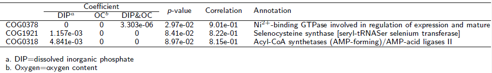 We applied the novel function of MetaComp, regression analysis of environmental factors, on metagenomic samples from Hawaii Ocean [1] (seeAdditional file 7for more details). The input reads were aligned against COG database [2]. The selected environmental factors are dissolved inorganic phosphate (DIP) and oxygen content (OC) (seeAdditional file 8for more details). Concluded from the detailed analysis results (seeAdditional file 9for more details), we discover 102 out of 4,873 COGs which are probably corresponding to the living environment of Hawaii Ocean (p< 0.1). Moreover, some of the selected COG features are related to the generation and consumption of Adenosine Triphosphate (ATP), which is evidently related to phosphate and oxygen. For instance, COG0378, as a Ni2+-binding GTPase involved in regulation of expression and maturation of urease and hydrogenase, will generate organic phosphorus as well as dehydrogenase. Moreover, this reaction may consume oxygen. It is obvious that this COG is linked to both DIP and OC. Details of these protein families are shown in Table 1. Meanwhile, COGs relevant to the content of DIP (e.g. COG0379, COG0458, COG0486, COG0849, COG1190 and COG1921) are selected by MetaComp (illustrated in Figure 1).
