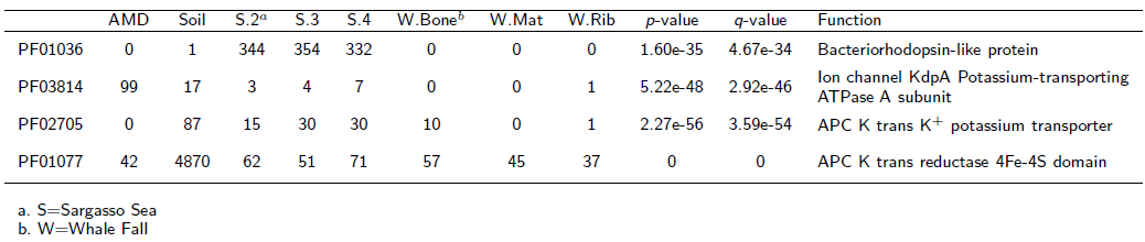 Table 1: Part of whale fall, Acid Mine Drainage, Sargasso Sea, and Minnesota soil metagenomic samples analysis result.