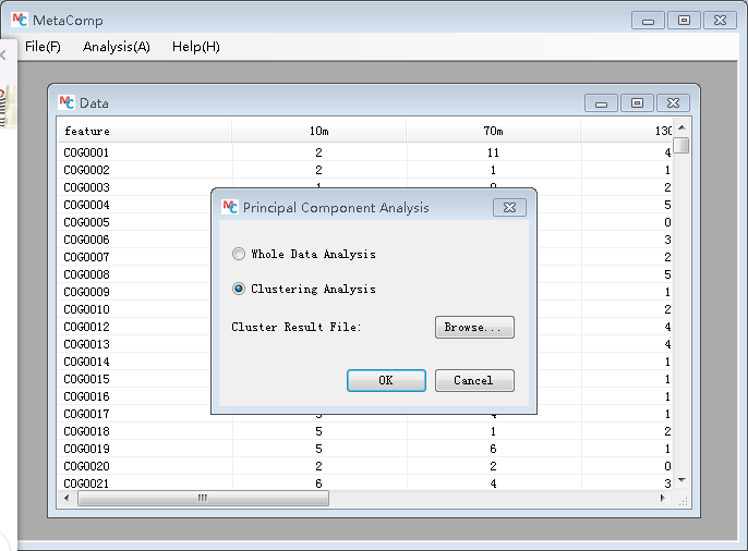 Principal component analysis (PCA) is applied in two model: whole data analysis model and clustering analysis model. Whole data analysis model is the model we common used. Also, clustering analysis model can apply PCA within the clustering information.The example of clustering information can be download from PCA can be applied through thePrincipal component analysisdialog inAnalysismenu.(Figure 27-29)