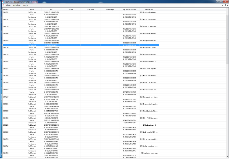 where xmj· xnjmeans the co-effect of environmental factor xmjand xnjto feature ykj. Then, αkiand βkmnrepresent the regression coefficient of the function. For any specific feature, the influence of environmental factors on samples is appraised by coefficient value and correlation value. Moreover, the reliability of the regression coefficient is determined byp-value. Only when allp-values meet the prescribed standard, the result of regression would be accepted by MetaComp.