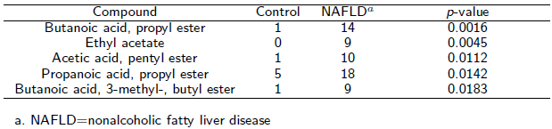 MetaComp conducted a two-samplez-test on NAFLD and control group, and results indicate that 15 out of 220 VOCs are significantly different between two groups (seeAdditional file 6andAdditional file 15: Figure S4for more information). Furthermore, most VOCs identified as significantly different are included in previous study expect indolizine and acetic acid butyl ester and it may because of lacking of hits (only 5 hits in appeared in healthy control samples) that makes it difficult to be detected in previous study. It is notable that 6 out of 8 VOCs enriched in NAFLD fecal samples are short fatty acid esters. These derivatives of short fatty acids reflect that a relatively high concentration of hexose dietary such as frequently drinking soft drinks with fructose, which is a cause of NAFLD (shown in Table 1)[2].