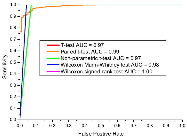 We further plotted the Receiver operating characteristic (ROC) curve (shown in Figure 1) to demonstrate the performance of all five hypothesis testing methods as well. This analysis indicated that area under ROC curve (AUC) was almost 1.0 and confirmed automatical selection (other than recommended by XCMS) of MetaComp was the most appropriate one.