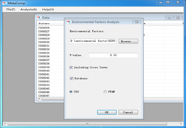 To operate environmental factors analysis, click on theEnvironmental factorsanalysis dialog inAnalysismenu. In this dialog, you need to load the environmental factors information, input thep-value, choose whether you require to include the cross term of environmental factors and load Pfam or COG database while analysing. The example of environmental factors information can be download from.(Figure 39-40)