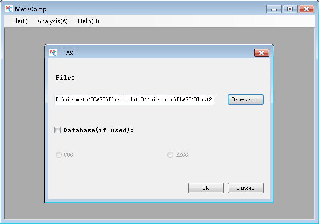 MetaComp also accepts meta-omics profiles obtained from BLAST ([2], https://blast.ncbi.nlm.nih.gov/Blast.cgi) result. MetaComp works directly with BLAST result obtained by clicking on download in result web page, followed by selecting Hit Table(text) output type choice. Moreover, the BLAST result file can be obtained from table format (-outfmt 7). MetaComp can convert these BLAST results to standard Abundance profile matrices (APM) data through selectingBLASTradio button fromProfiledialog box inLoad Dataoption withinFilemenu. After opening up theBLASTdialog box, you can select the BLAST result files you wish to input. (Figure 4-6)