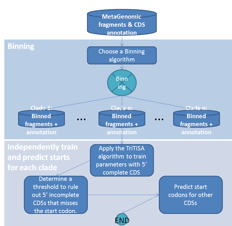 The method constitutes two steps in TIS prediction. First, it uses binning techniques to classify all input fragments. Fragments binned in the same clade are assumed to have closely phylogenic origin, and hence share a similar mechanism in translation initiation. Then, the recently developed tool, TriTISA, is modified to predict TIS for each clade of fragments in an unsupervised iterative manner.