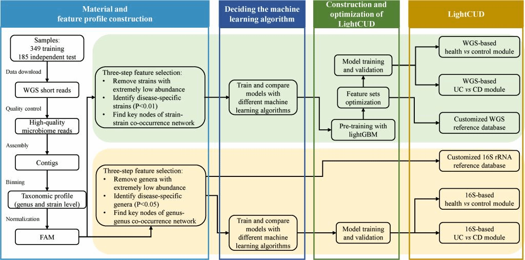 The diagnosis of inflammatory bowel disease (IBD) and discrimination between the types of IBD are clinically important. IBD is associated with marked changes in the intestinal microbiota. Advances in next-generation sequencing technology and the improvement of hospital bioinformatics analysis ability motivated us to develop a diagnostic method based on the gut microbiome. Using a set of whole-genome sequencing (WGS) data from 349 human gut microbiota samples with two types of IBD and healthy controls, we performed processing for metagenomics short reads to obtain feature profiles of strains and genera. The genus and strain profiles were used for the 16S-based and WGS-based diagnostic modules construction separately. For all module construction, we designed several steps of statistical analysis to select case-specific features. With these features, we built discrimination models using different machine learning algorithms. The algorithm LightGBM outperformed other algorithms, and thus was chosen as the core algorithm in the study. Specially, we identified two small set of biomarkers (strains) separately for WGS-based health vs IBD and ulcerative colitis (UC) vs Crohn’s disease (CD) diagnostic modules, which contributed to the optimization of model performance during pre-training. We released LightCUD as an IBD diagnostic program based on lightGBM. The high performance has been validated with five-fold cross validation and also a test set from other study. LightCUD was implemented in Python and packaged free for installation with customized databases. With WGS data or 16S rRNA sequencing data of gut microbiota samples as input, LightCUD can discriminate IBD from healthy controls with high accuracy and further identified the specific type of IBD. The executable program LightCUD is released here as open source. The identified strain biomarkers can be used to study the critical factors for disease development and treatment with regard to changes in the gut microbial community. |