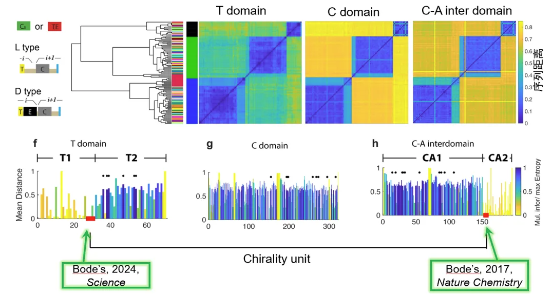 图13. cEK NRPS中的手性单元。上图的左至右依次为基于T蛋白域的氨基酸序列的层次聚类树状图所排列的T、C蛋白域和C–A间域的序列距离矩阵。树状图右侧色块分别显示了NRPS通路标识和手性亚型(L type 和D type)。下方条形图是T域、C域和C–A间域在多序列比对后得到的平均序列距离(条形高度)和氨基酸与手性亚型之间的互信息(条形颜色)。手性功能单元从T1基序开始,以CA基序结束(红色片段)。Bode组的两篇NRPS重编程工作中的切点用绿色箭头指出。
