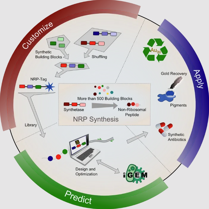 然后合作者还告诉我一件有趣的事:因为NRPS这个"以模块化的流水线生产肽链"的特性,数十年来合成生物学一直蠢蠢欲动,梦想着做NRPS的重编程——把一个个抓取特定底物的模块切开后拼接起来,那不就是要什么产物有什么产物!两三百种非蛋白源氨基酸随你挑!(图6)
