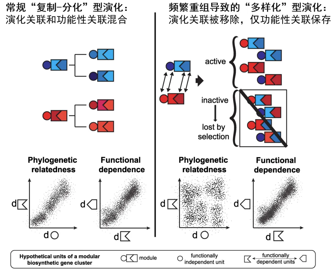 图12. 不同演化模式(左:常规的duplication-divergence mode,右:diversifying evolution mode)下,模块化的基因中演化关联(圆形和凹多边形)的功能性关联(凹多边形-凸多边形)如何能在序列距离上被观测到。