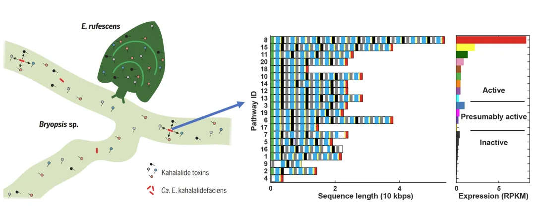图3. 羽藻中的“雇佣军”Ca. E. kahalalidifaciens和它基因组中的20条NRPS通路