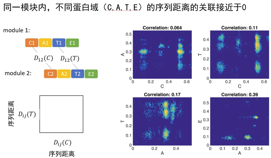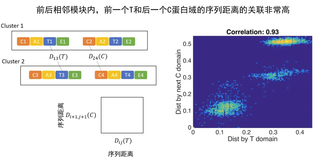 图8. 左边是示意,展示两个在同一模块中的蛋白域的序列距离的关联是如何计算的;右边是实际计算出的C,A,T,E等功能域之间的序列距离关联。