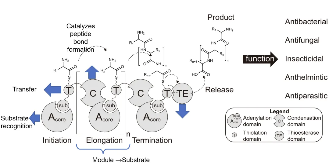 【知识窗2】NRPS:非核糖体多肽合成酶(Non-ribosomal peptide synthetase,NRPS)——是的,它是一个绕过中心法则直接从氨基酸合成多肽的合成酶——但它跟RNA world没啥关系,因为它自己就是个上千个氨基酸起步的巨大的酶(我总是被问到这个问题)。它是微生物中最广泛的次级代谢酶系统之一,能够合成结构复杂和活性都高度多样的分泌型多肽产物。这些产物包括许多重要的抗生素,如青霉素、万古霉素、搏来霉素等。