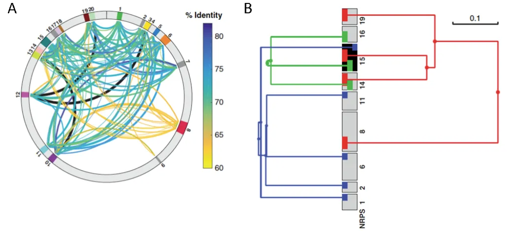 图5. cEK NRPS之间的疯狂重组。(A)中每条连线都代表一次推断出的重组事件,而(B)示例了9条NRPS中片段重组的频繁程度——红、蓝、绿色的聚类树各自连起3组在NRPS-15中出现的基因片段,而和这些片段高度相似的核酸片段以迥然不同的方式散步在其它不同的NRPS中。