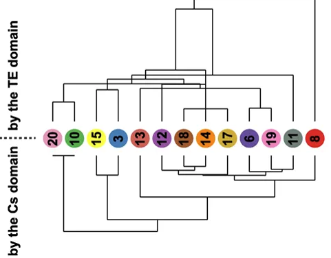 T domain,下一个模块的C domain,甚至延伸到下个模块的A domain之间的interdomain,都和“手性”这个功能相关:当它们中间有个改变底物手性的E domain时,它们的序列是一种;当没有E domain时,又是另一种。这一大片序列,构成了cEK NRPS中的“手性功能单元”。
