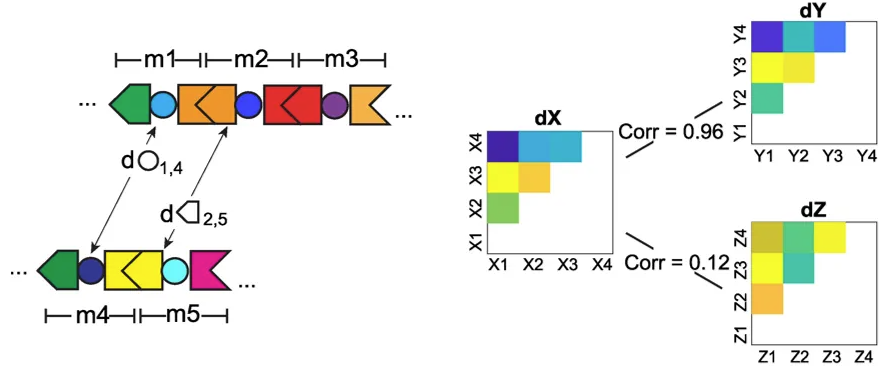 图7. 左图是一个假想的模块化酶,由三种类型的蛋白域组成,分别以凹多边形、圆形和凸多边形表示(也以X,Y,Z指代)。“m”表示模块。右图示意了通过计算同一类型的蛋白域之间的两两距离产生出的距离矩阵, 而两个类型之间的关联程度由它们各自的矩阵之间的相关系数来定量。