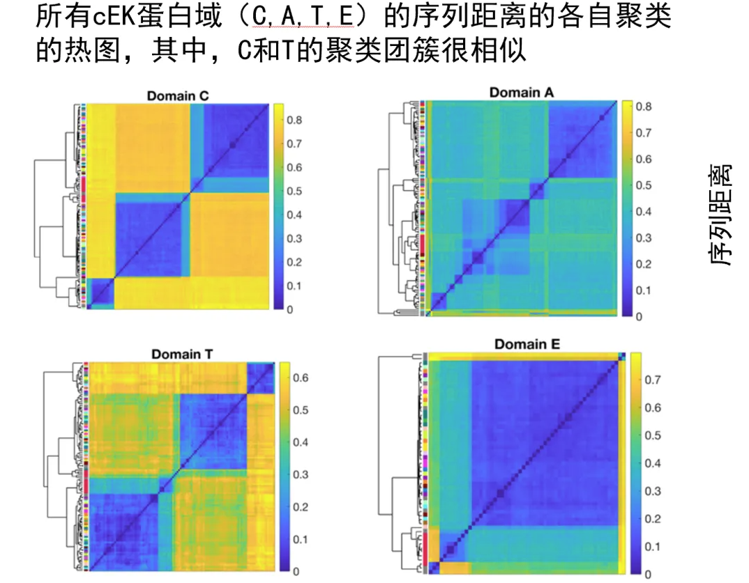 图9. cEK蛋白域(C,A,T,E)的序列距离的各自聚类的热图。其中,C和T的聚类团簇很相似,都是大中小三个cluster